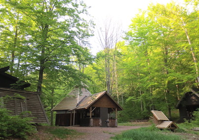 Her i Aarholt-skogen litt over en kilometer fra gårdstunet, går en elv hvor det også er mye spor etter beverens herjinger. Navnet ”Aarholt” kan antagelig komme av ”Holtet ved Aaen – elva”. Og i kort avstand fra elva finner du Villmarkstunet. Et område med små gapahuker for overnatting og en MEGA-huk for grilling, kveldskos, og overnatting. De ti små gapahukene kan huse 30 stk. til sammen, og MEGA-huken (bildet over) – 30 alene til overnatting eller 60 til bespisning inne rundt bålet - hvis det regner ute. MEGA-huken er sannsynligvis ulikt alt annet du har sett. Med syv takretninger, overbygget bålplass i midten og gulvplass som i et slags amfi - til å sitte og kose seg på. Alle gapahukene har liggeunderlag på gulvet.